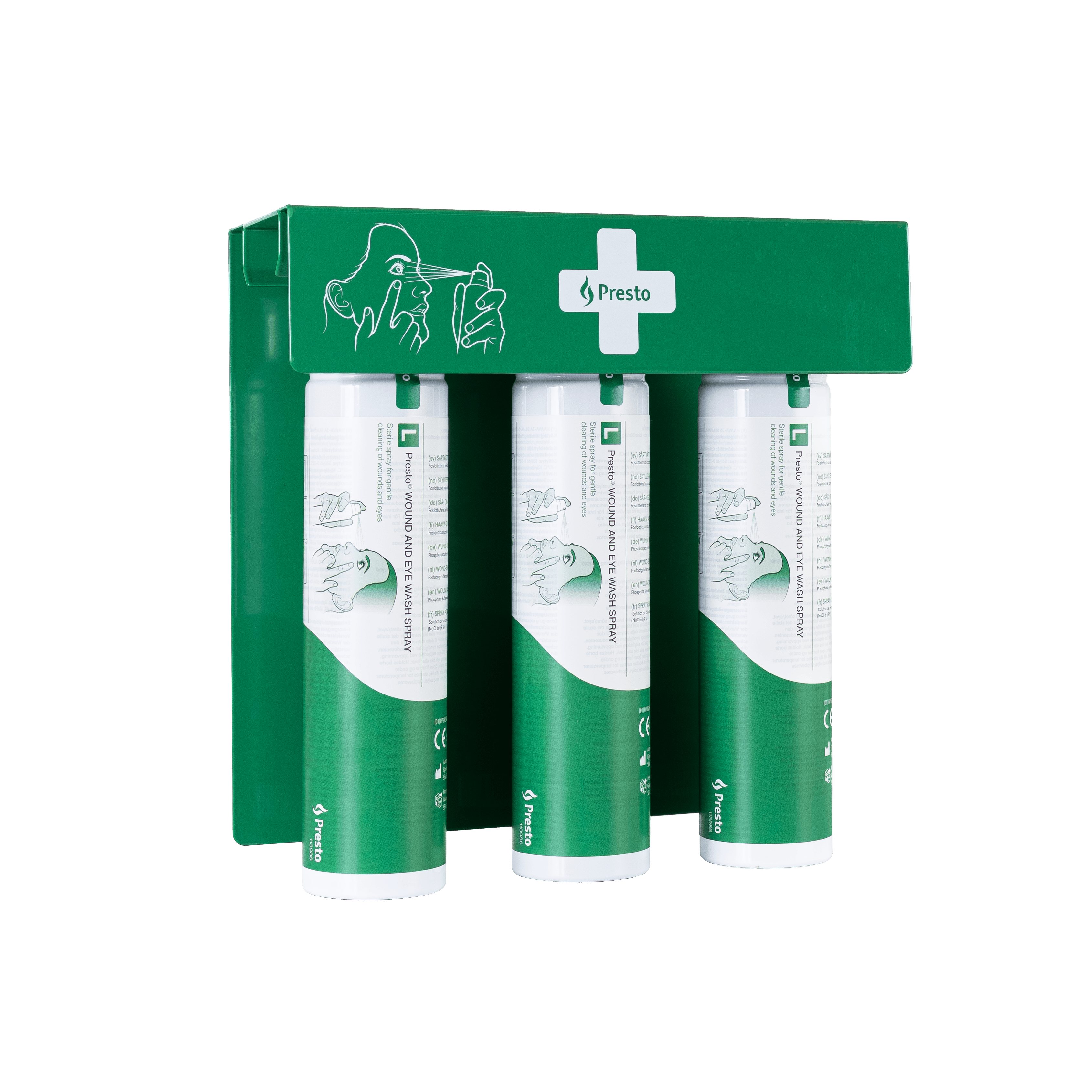 Väggfäste i grön plåt för Presto Ögon- och sårspray, 3 flaskor á 250 ml med svampkork.